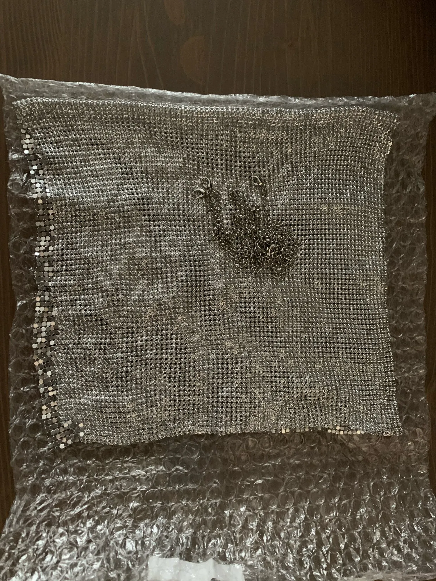 Elegant cropped top in metallic and shiny color. It looks like a sheet of small round metal scorers that attach with two chains, one in the neck and the other under the chest to tighten it against the body! Really very pretty, it was delivered in 24 days for Belgium
