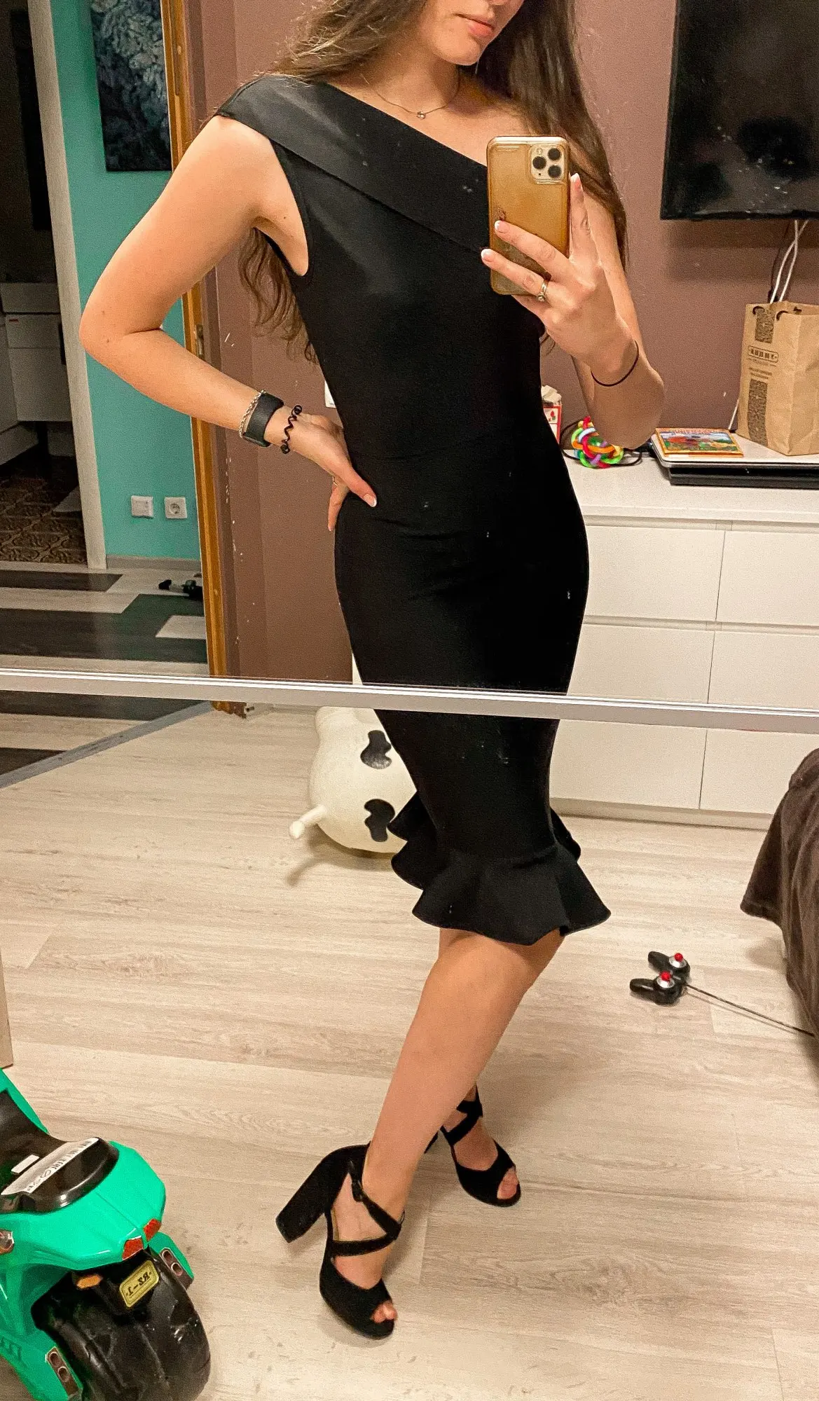 Chic dress, bought for 1700₽, size 44 height 178, ideal M. Fabric quality, no smell. The village is perfect!