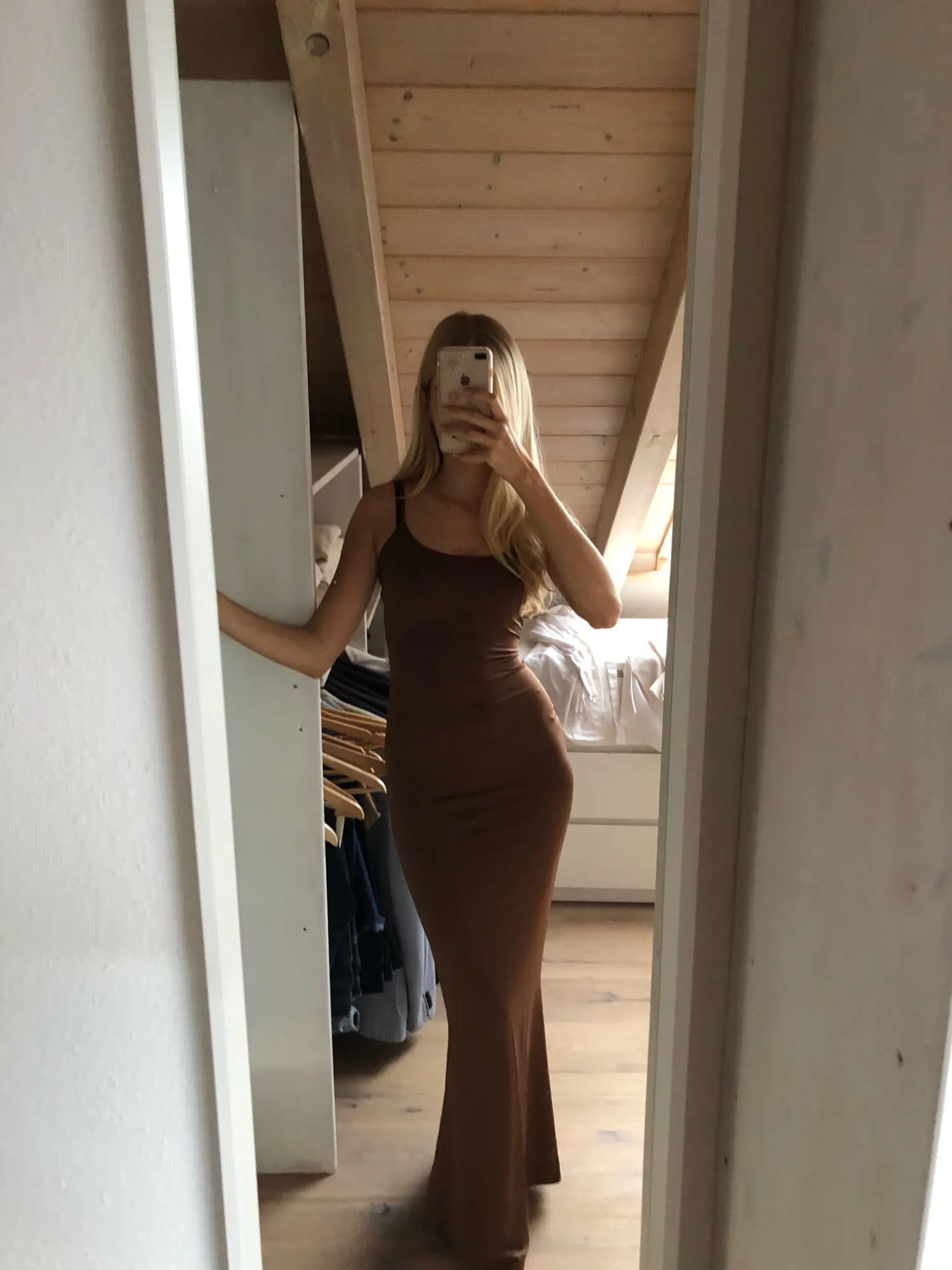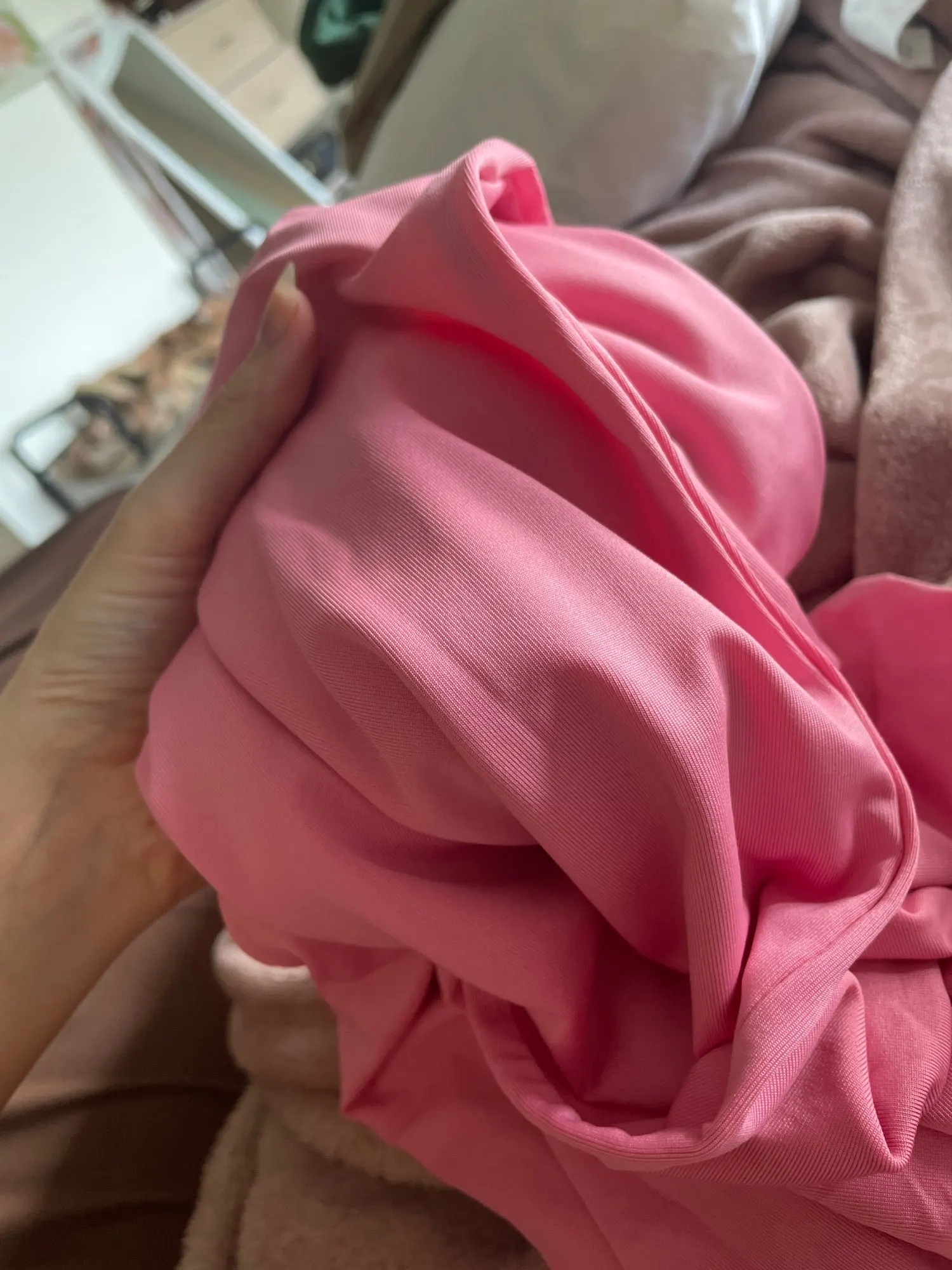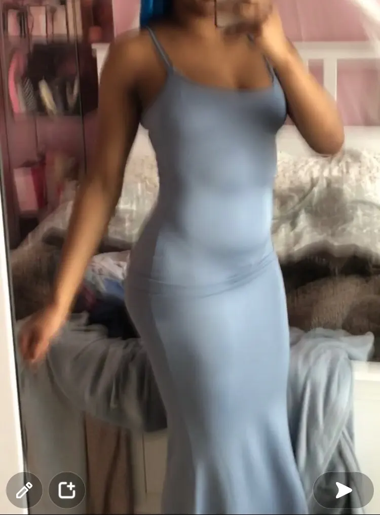 It’s a super stretchy fabric but clings on to everything which can be a bit unflattering sometimes. But it fits so well! I got an XS and I’m 5’4, 23 inch waist and it’s perfect! Very similar shape to skims, just different neckline and fabric.