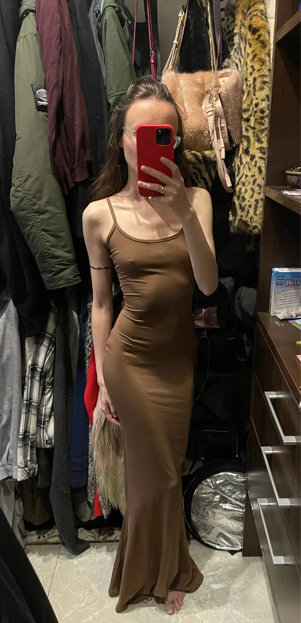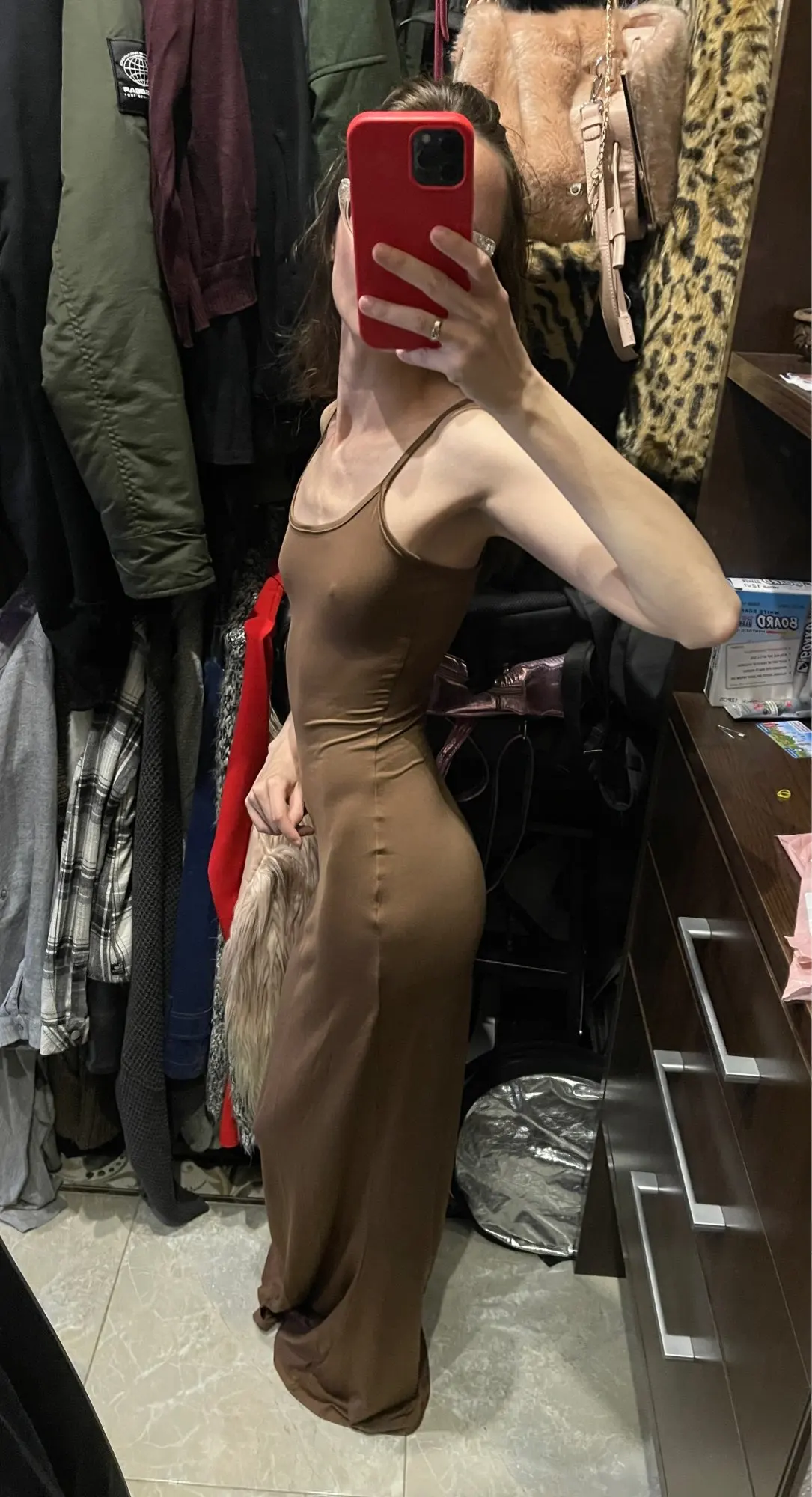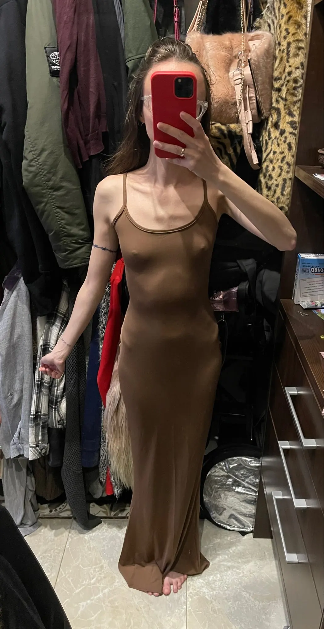 It’s a super stretchy fabric but clings on to everything which can be a bit unflattering sometimes. But it fits so well! I got an XS and I’m 5’4, 23 inch waist and it’s perfect! Very similar shape to skims, just different neckline and fabric.