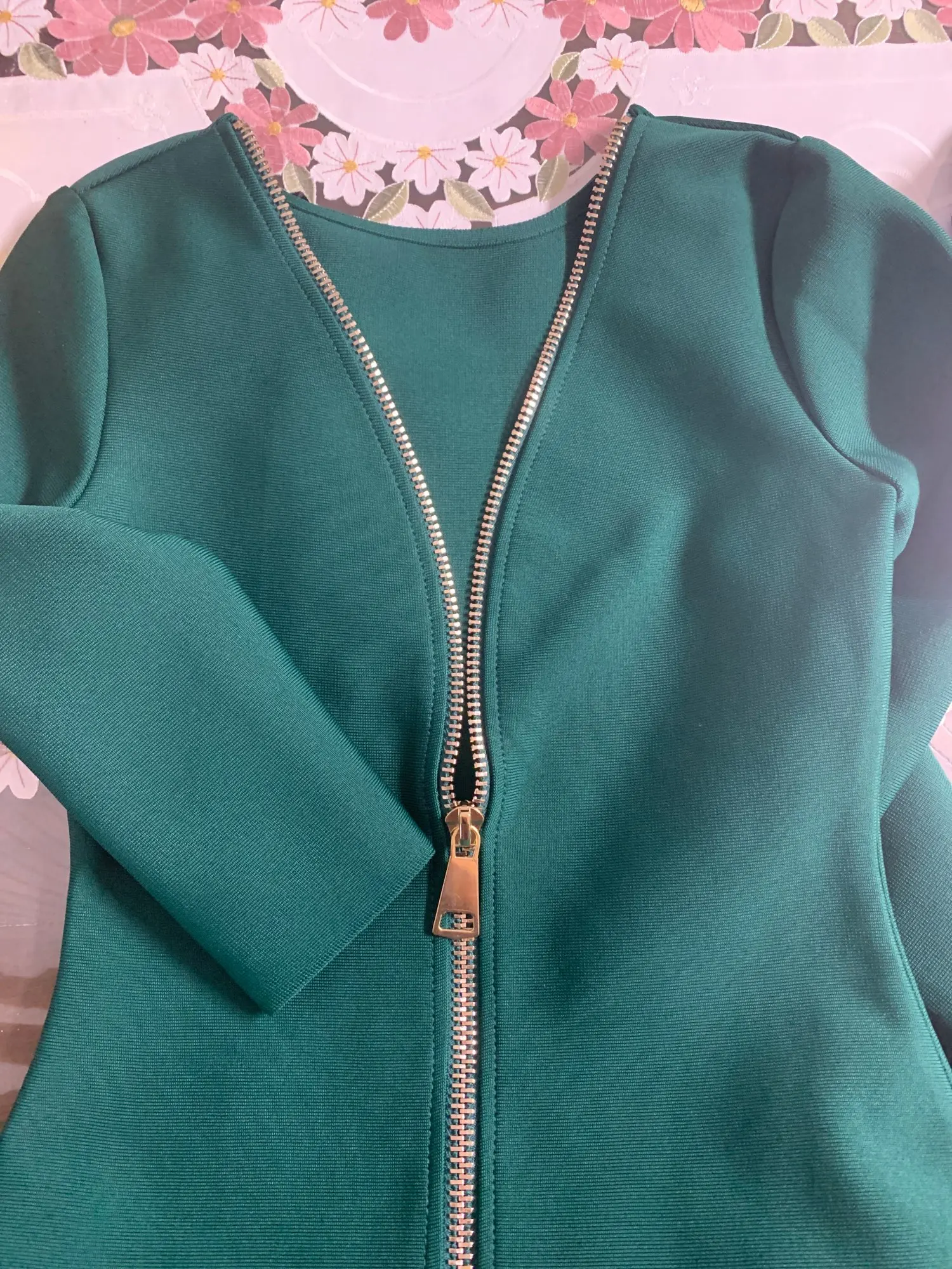 Dark green like in the original photo. Happy with quality. Took picture to show texture and zipper. My photo is lighter than in person. It’s dark green.