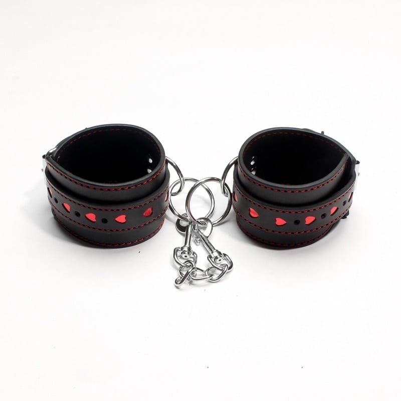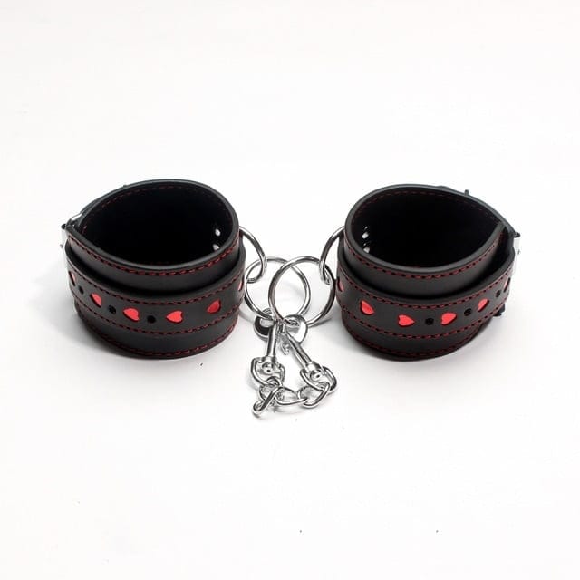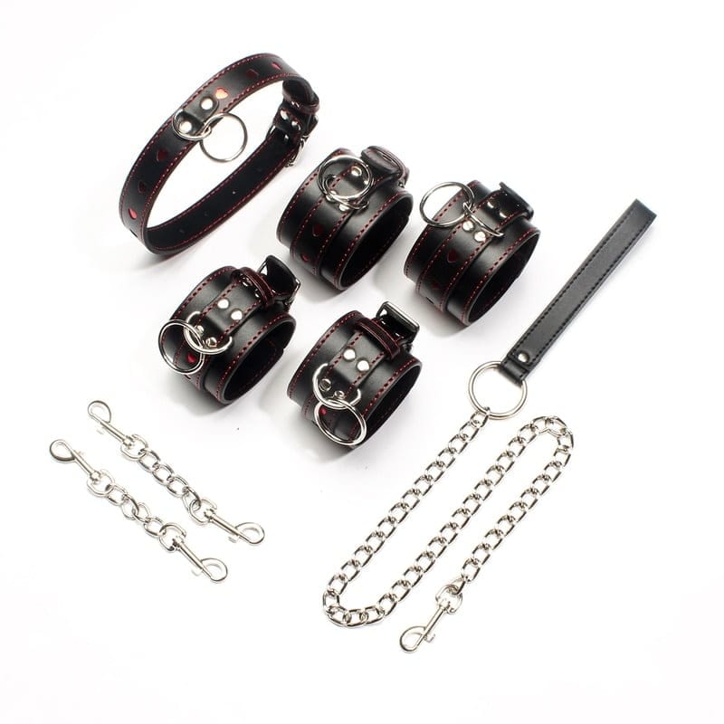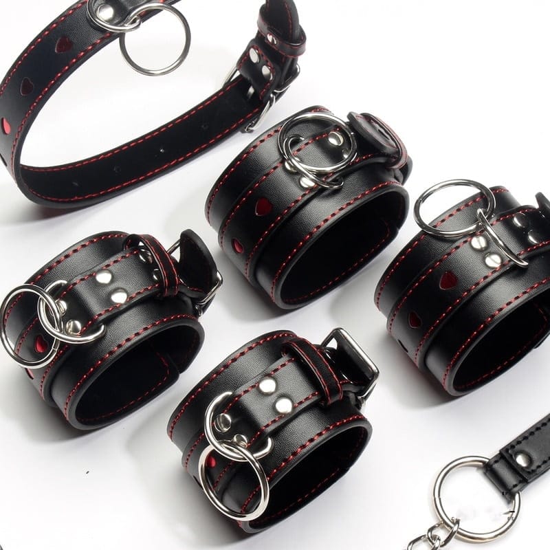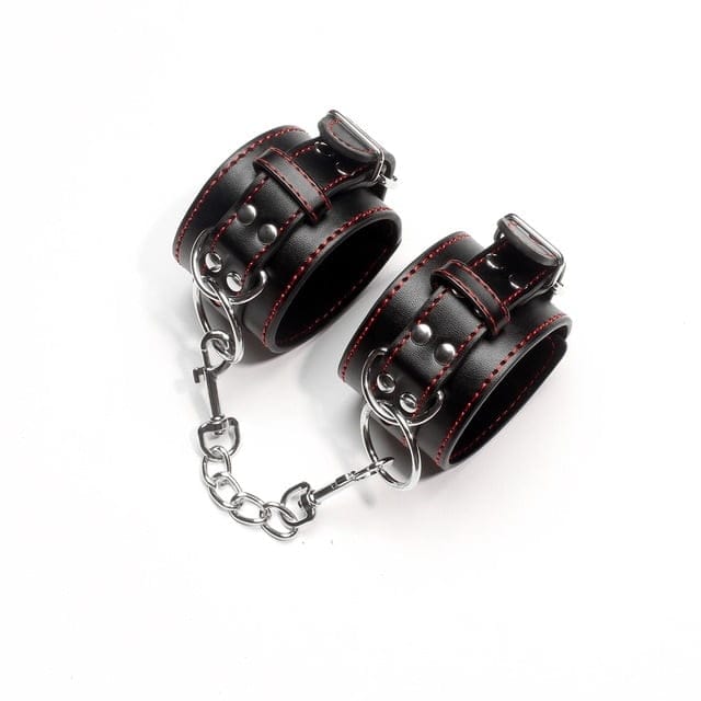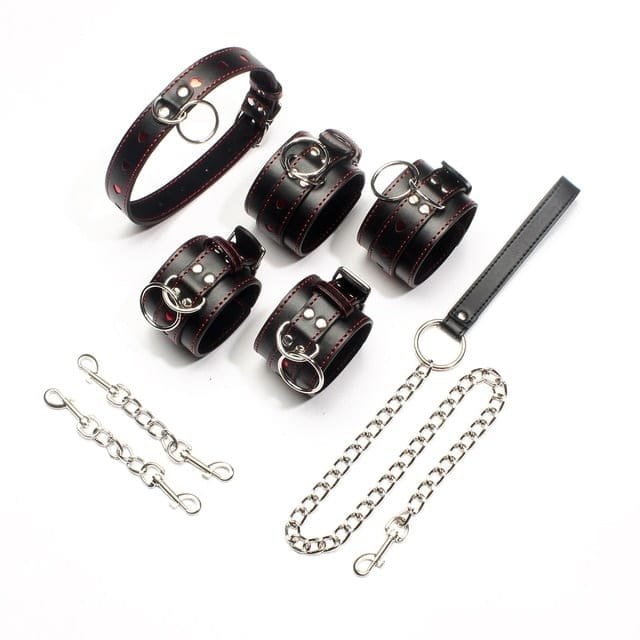 All as in the photo of the seller. As a gift put an gag for the mouth, thank you. Sorry chains on handcuffs were torn for the first time, we will replace them.